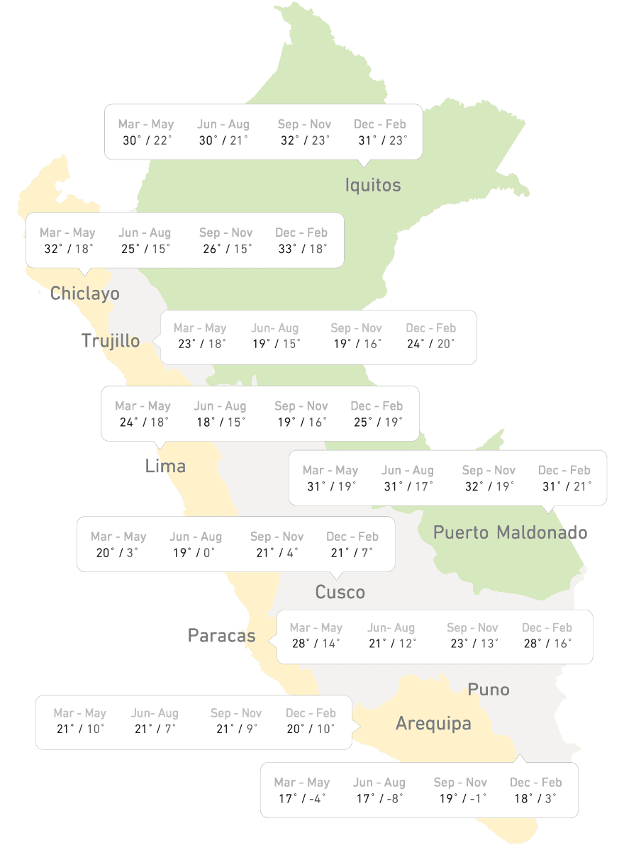 Das peruanische Klima lässt sich in zwei Jahreszeiten einteilen - feucht und trocken -, wobei dies je nach Region variieren kann. Die Temperatur wird hauptsächlich durch die Höhe beeinflusst: Je höher man steigt, desto kühler wird es.