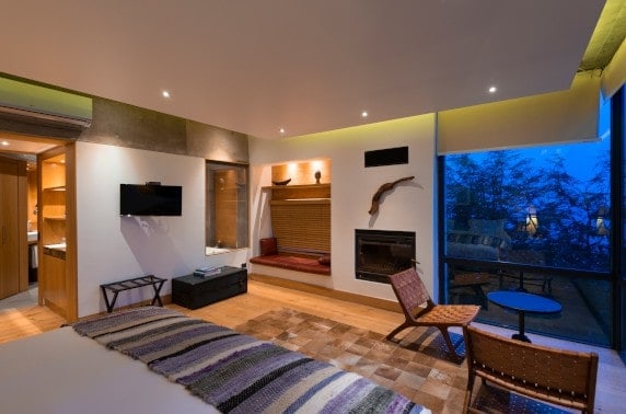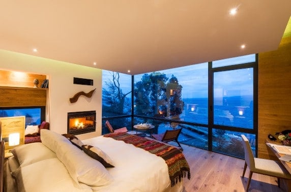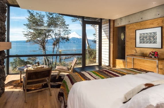 The hotelier, who lives on-site, is himself an architect and designer, giving the property a very ‘labor of love’ feel, with every detail being carefully considered, right down to the diagonal orientation of the rooms and suites, which are positioned for privacy, views, and optimal sun exposure. Besides its picturesque setting, the hotel’s accommodation offers an equally spectacular experience, where you can unwind in spacious rooms that boast floor-to-ceiling windows, perfectly framing the views of the lake and the snow-capped Osorno volcano. Interior spaces are adorned with local crafts and artwork which truly reflect the essence of the region. Each of the 16 rooms are equipped with cable tv, fireplace, a super king bed or two twin beds and bathroom with separate shower and tub (some of which face Lake Llanquihue).