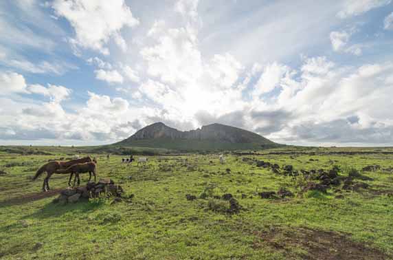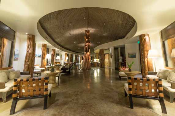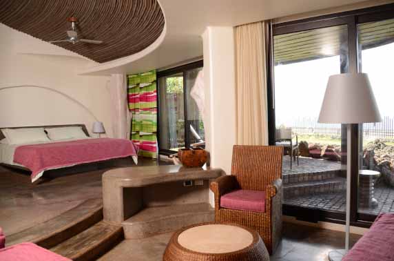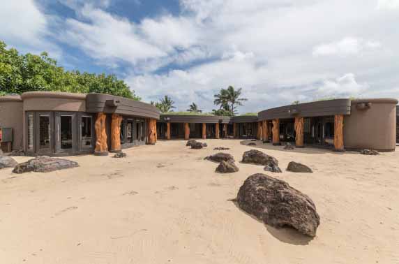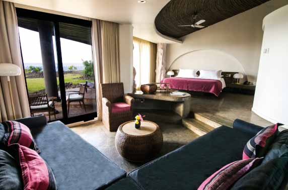 If you have already taken a look at some of the archeological sites around the island, you may notice that the same grass-covered almost cavelike houses of the Rapa Nui people has a striking similarity to the hotels huts, and that is because this eco-hotel has been fashioned in such a way to complement its surroundings while staying true to its roots. Each of the huts/rooms has ample space with a stunning ocean view and all of the usual amenities that you might expect from a home away from home, complete with a free minibar, coffee machine and french styled doors that open up onto a private terrace. The wooden pillars throughout the property give it a somewhat rustic feel, with the whitewashed walls and minimalistic décor adding to the modern yet warm feel of the entire hotel.