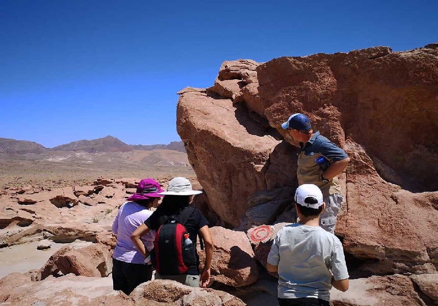 Embark on a 4-hour tour from San Pedro de Atacama to witness the stunning landscapes of Rainbow Valley and the ancient petroglyphs of Yerbas Buenas. First, you'll head towards Yerbas Buenas, which is approximately 90 km from San Pedro. Along the way, you'll see breathtaking views of the Cordillera Domeyko mountain range in the Andes on the horizon. Once you arrive at Yerbas Buenas, you'll visit its ancient petroglyphs and learn about the history of the people who inhabited the area thousands of years ago. After a short break to enjoy your snack, you'll journey across the ancient farmlands of Matancilla to reach Rainbow Valley. Make sure to keep your camera handy as you weave your way through its multi-colored rock formations.
