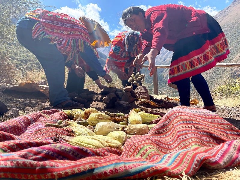 You will then arrive at the Cancha Cancha community, home to over 70 native Quechua-speaking families dedicated to self-sustaining agriculture. Surrounded by picturesque glaciers, you will be invited for a delicious traditional brunch at one of the local families’ homes. Your meal includes a tasting of 3 different varieties of native potatoes prepared in a Peruvian ‘earth oven’ known as a huatia, along with broad beans, sweet potatoes oca, and chicken. You will also get a fruit, an energy bar, coca tea and something sweet.